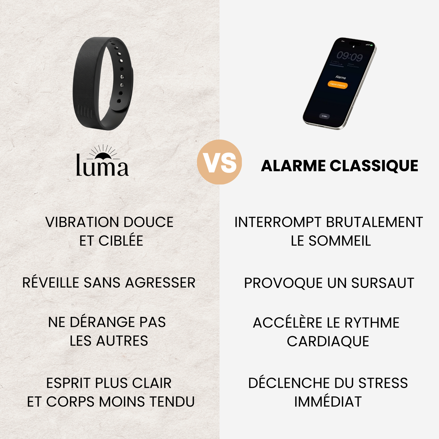 Luma™ vous réveille grâce à une vibration douce et progressive directement au poignet, un signal que le cerveau perçoit naturellement, même lorsque les alarmes sonores finissent par être ignorées ou coupées machinalement.